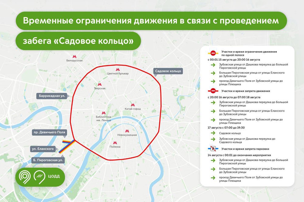 А 17 августа с 07:00 до 19:30 на всем протяжении Садового кольца в оба направления, а также на Зубовской улице (от Дашкова переулка до Садового кольца) будет полностью перекрыто движение.