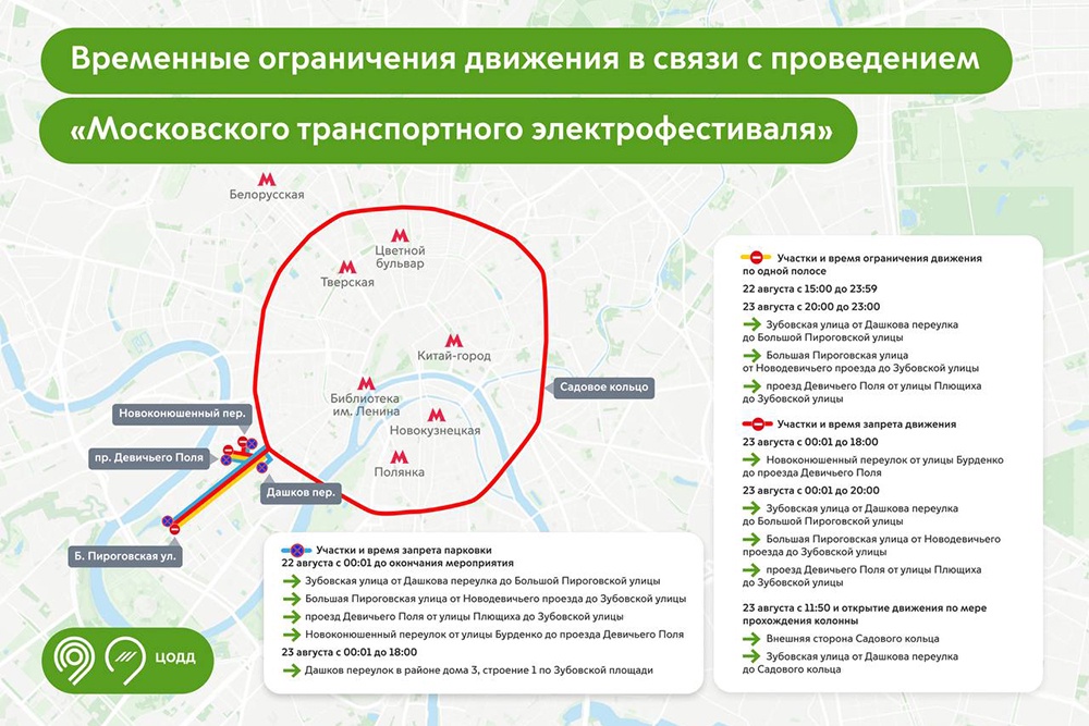 22 августа с 00:01 до окончания мероприятия будет запрещена парковка на участках улиц Зубовской, Большой Пироговской, в проезде Девичьего Поля и Новоконюшенном переулке. А 23 августа с 00:01 до 18:00 - на участке Дашкова переулка.