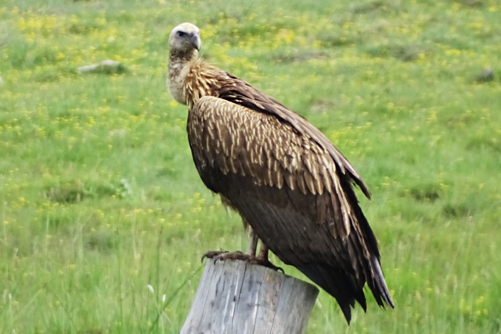 Кумай, или снежный гриф (его еще называют гималайским грифом) попал в поле зрения сотрудницы федерального учреждения "Заповедное Прибайкалье" во время летнего полевого выезда в Тажеранские степи. Гриф сидел у дороги не один, а в компании степного орла. Они вместе трапезничали, и орнитолог Марина Алексеенко успела сделать фотоснимки.
