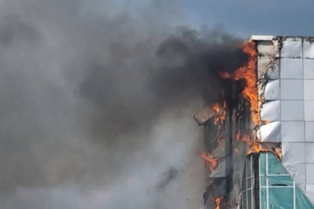 В соцсетях сейчас распространяются фото и видео с места пожара. На кадрах с горящего фасада здания падают обугленные куски обшивки, идет густой дым.