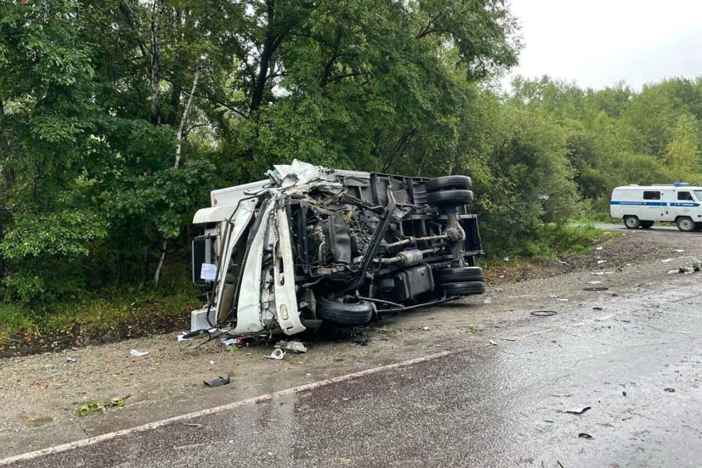 ДТП произошло утром в субботу, 23 августа, в районе 56 километра федеральной автодороги А-370 "Уссури". По предварительным данным, водитель автомобиля Toyota Noah выехал на полосу встречного движения и допустил лобовое столкновение с грузовиком Mitsubishi Canter.