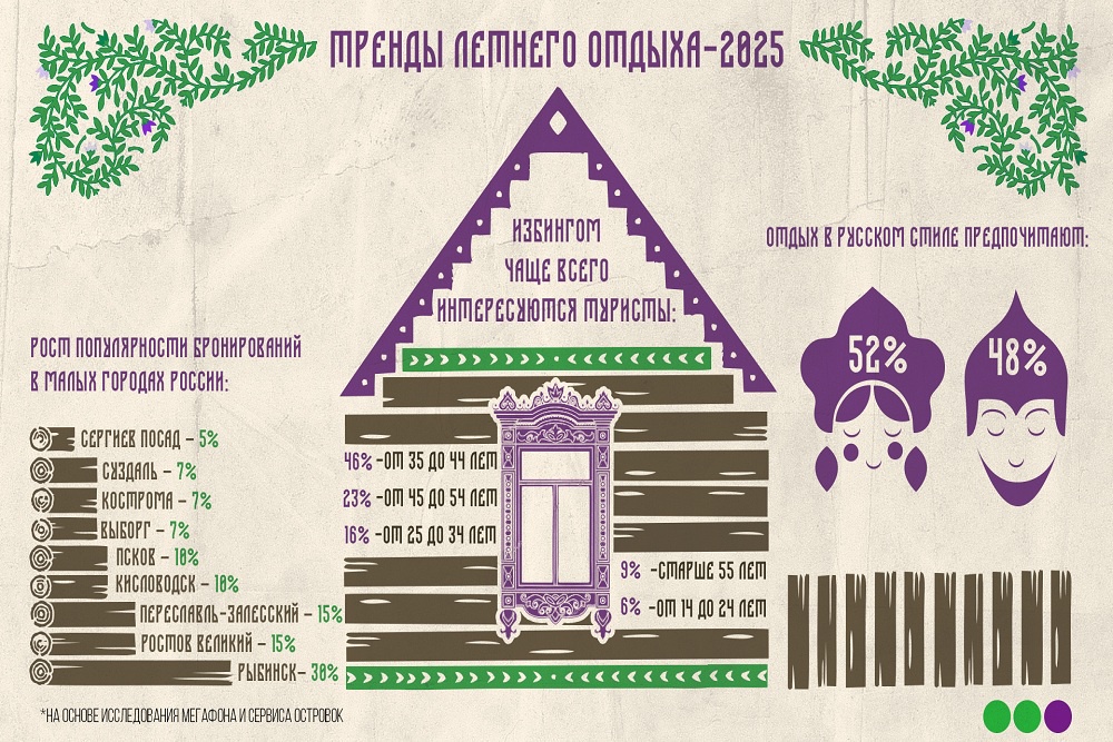 "Мы видим повышенный интерес туристов к путешествиям по направлениям, где сохраняется историческая и культурная самобытность, а ритм жизни задает более спокойный темп. Одновременно с этим в малых городах активно развивается туристическая инфраструктура в русском стиле: на Островке путешественники могут забронировать отреставрированные избы, старинные терема или дизайн-отели, вдохновленные национальным колоритом. Такие поездки становятся возможностью глубже познакомиться с культурой русской провинции: изучить местные традиции, посетить музеи и культурные центры, поучаствовать в ремесленных мастер-классах", - отметила управляющий директор сервиса Островок Дарья Кочеткова.