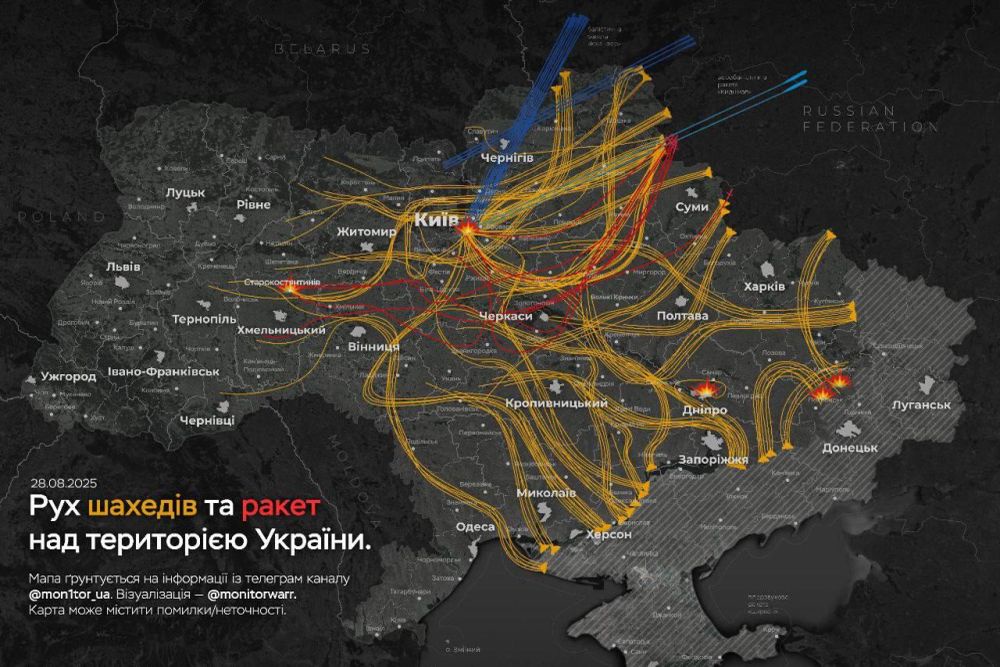 Мониторинговые ресурсы опубликовали карту ночного удара БПЛА и ракет по военным объектам на территории Украины.