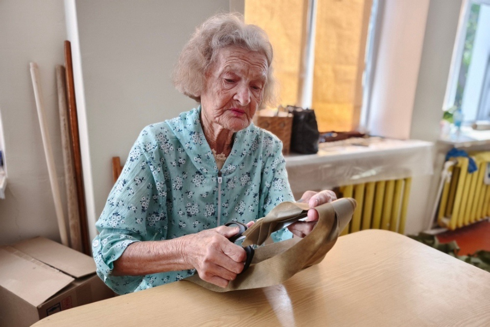 Пока мы общаемся, к коллективу присоединяется Любовь Афанасьевна Кузьмина. Она - официально признанный самый старший волонтер Крыма. В свои 88 лет женщина приходит в группу и вручную нарезает ленту на лоскуты.