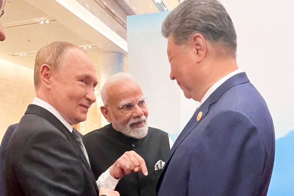 На снимке, о котором идет речь, Путин, Моди и Си Цзиньпин на полях саммита Шанхайской организации сотрудничества (ШОС) в КНР что-то живо обсуждают, при этом Путин улыбается.