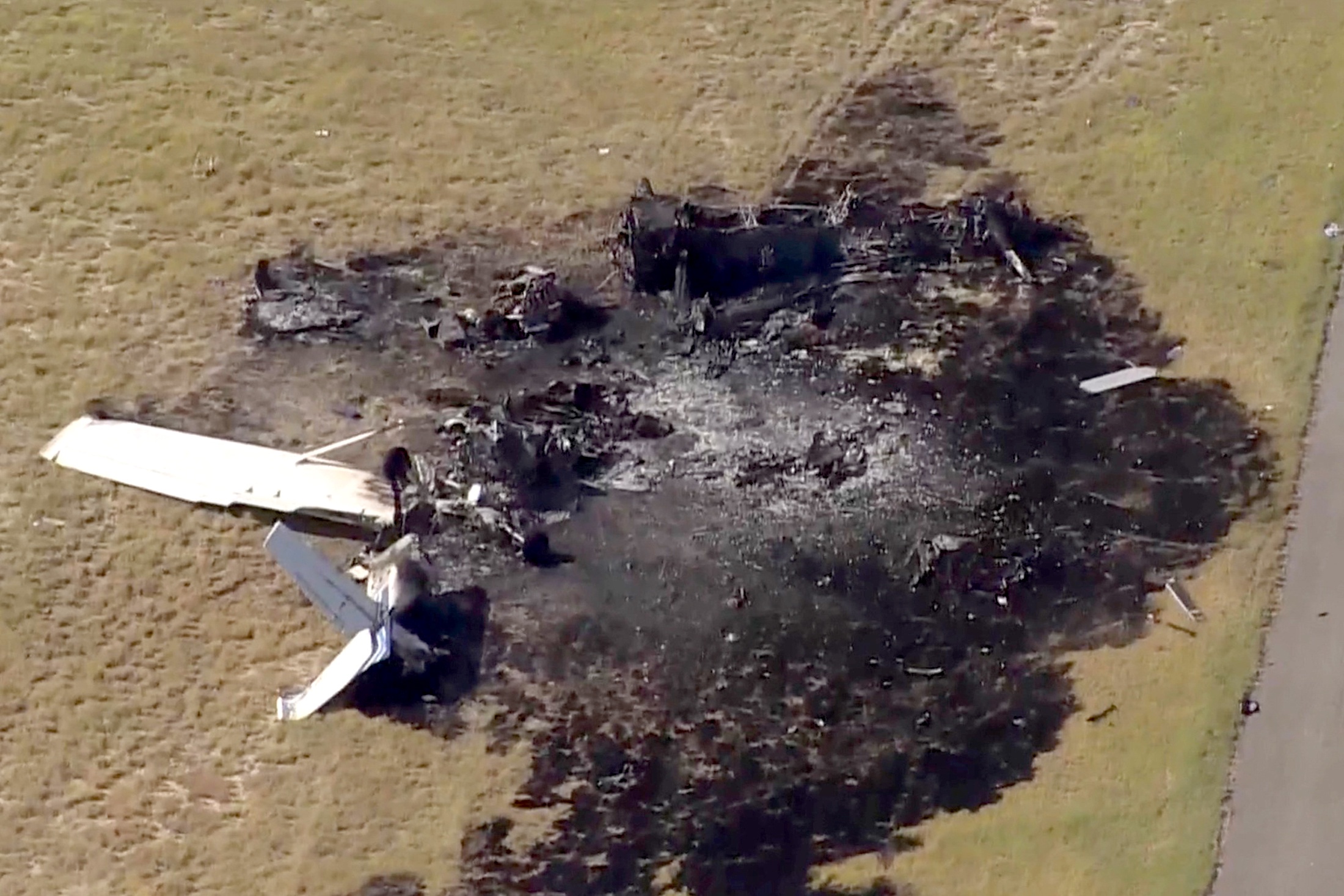 Издание также опубликовало кадры с места происшествия: на них на земле лежат обломки сгоревшего самолета, от которого остались лишь крыло и хвост.