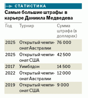 На Открытом чемпионате Австралии-2025 в Мельбурне Даниил провел все два матча и проштрафился в каждом из них. В первом круге во время игры с тайцем Касидитом Самреем россиянин разбил камеру на сетке ракеткой - это стоило ему 10 тысяч долларов. Также по ходу встречи Медведев ругался с судьей на вышке.