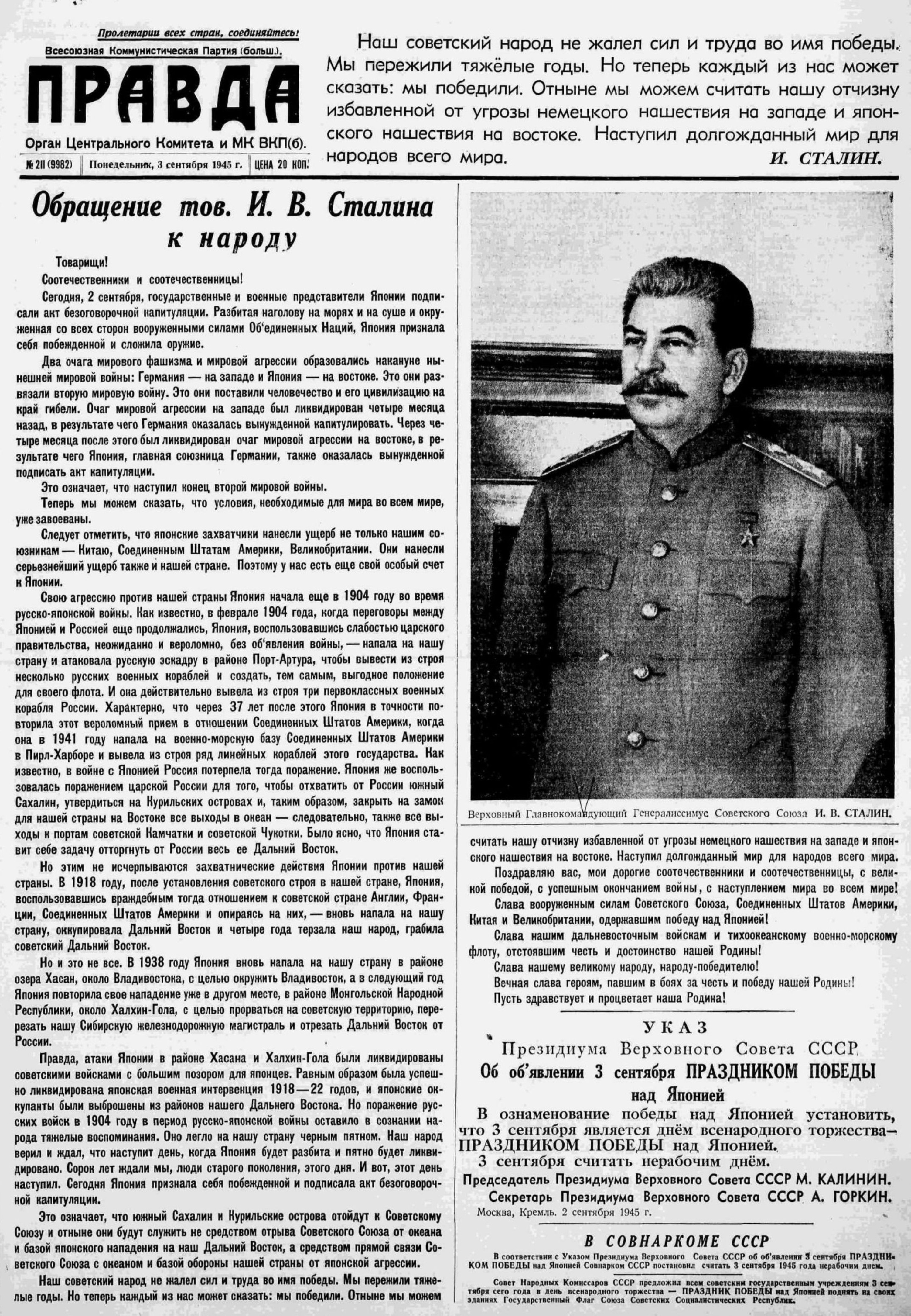 Главные военные преступники, виновные в неисчислимых жертвах мировой бойни, были осуждены Нюрнбергским трибуналом и понесли заслуженную кару. Но оставался еще один очаг военной опасности - союзница фашистского рейха милитаристская Япония. 9 августа 1945 г. СССР вступил в войну на Дальнем Востоке и сыграл решающую роль в разгроме врага. Советские войска менее чем за месяц наголову разбили главную японскую военную силу - миллионную Квантунскую армию, освободили захваченную японцами Манчжурию и Корейский полуостров до 38-й параллели. 2 сентября Япония капитулировала.