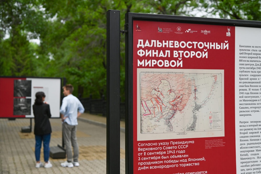 По традиции в канун праздника стартовала всероссийская акция "Дальневосточная Победа" - волонтеры раздают жителям и гостям ДФО муаровые ленточки, какие были на колодке медали "За победу над Японией". Как и в прошлом году, 3 сентября молодые хабаровчане на центральной набережной Амура развернут 300-метровые муаровую и георгиевскую ленты, как символ Дальневосточной Победы.