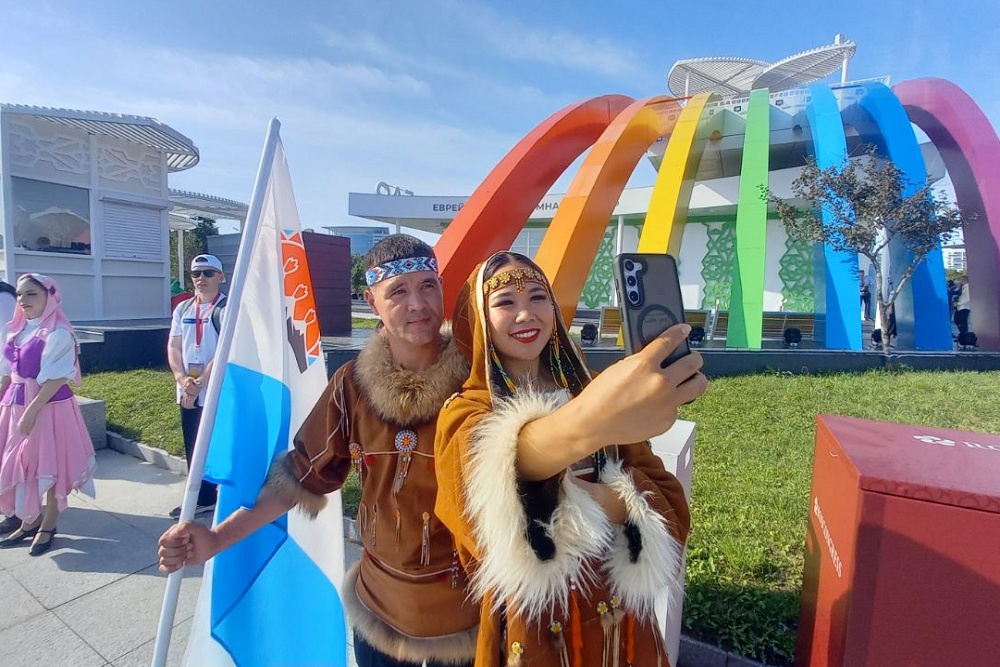 За час до старта на набережной многолюдно: участники в национальных костюмах, духовой оркестр, представители регионов выстроились на местах. В тенечке стараются держаться артисты национального театра танца из Республики Саха (Якутия). В +25 они в костюмах, отороченных мехами, и в теплых головных уборах. Даже смотреть жарко!