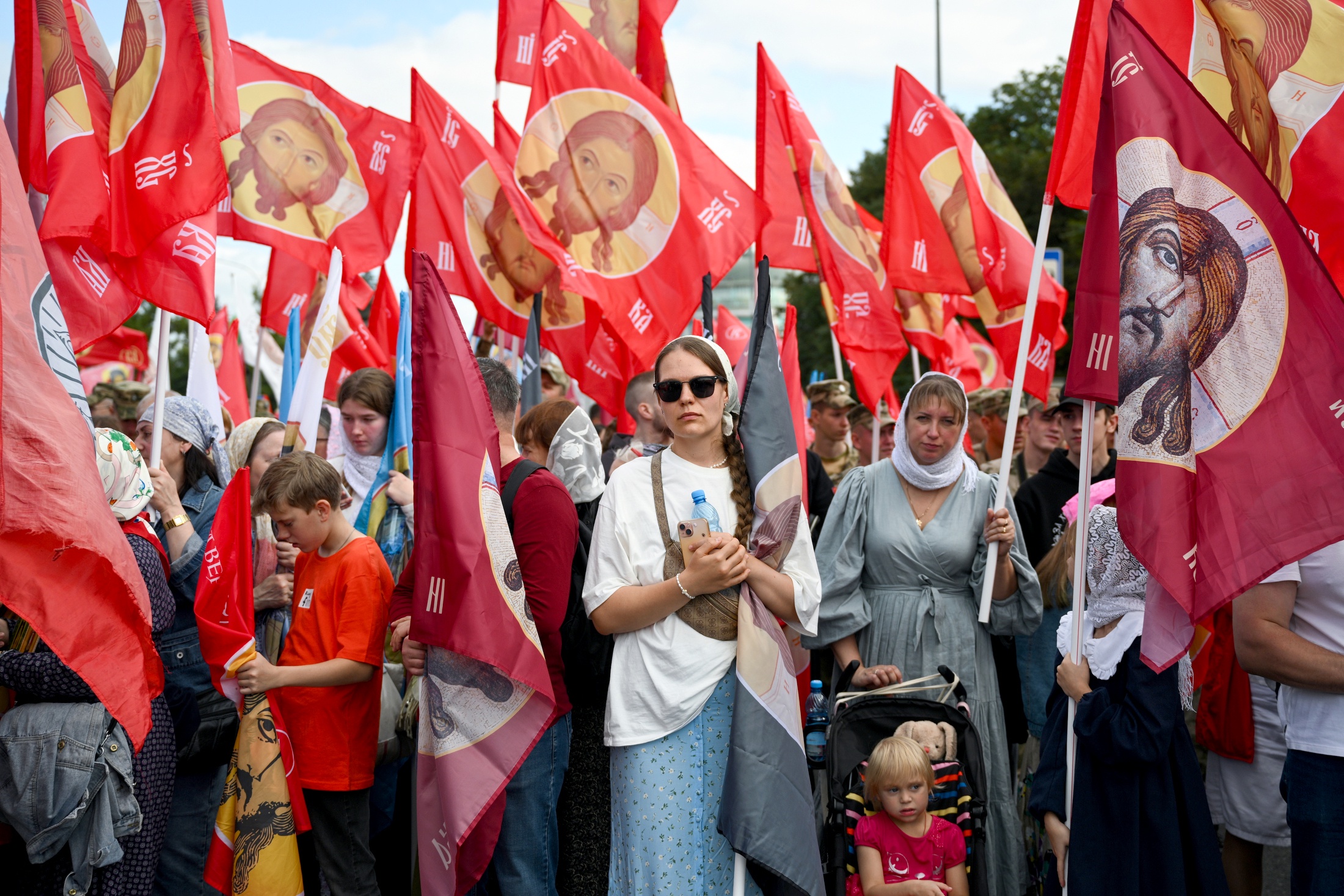 Народ самый разный, социально пестрый. Молодожены, старушки, малые детки в колясках, священники вперемежку с мирянами, семинаристы, среди которых выделяются африканские студенты, впрочем, такие же православно сдержанные, как и наши. Особое внимание группе участников СВО. У них на груди медали, над ними красный флаг с ликом Спасителя, который раздают бойцам на СВО, у одного на шевроне вышит позывной "Архангел".