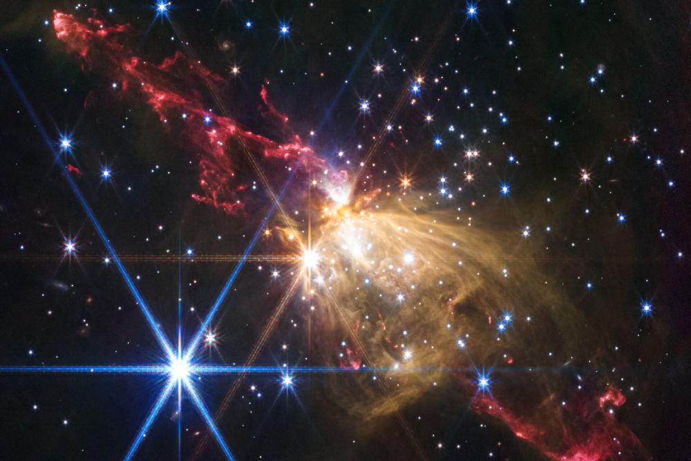 Снимок был сделан камерой ближнего инфракрасного диапазона NIRCam и показывает бурлящие двойные струи газа, выбрасываемые протозвездой. Длина этих струй достигает восьми световых лет - это вдвое больше расстояния от Солнца до ближайшей звездной системы Альфа Центавра.