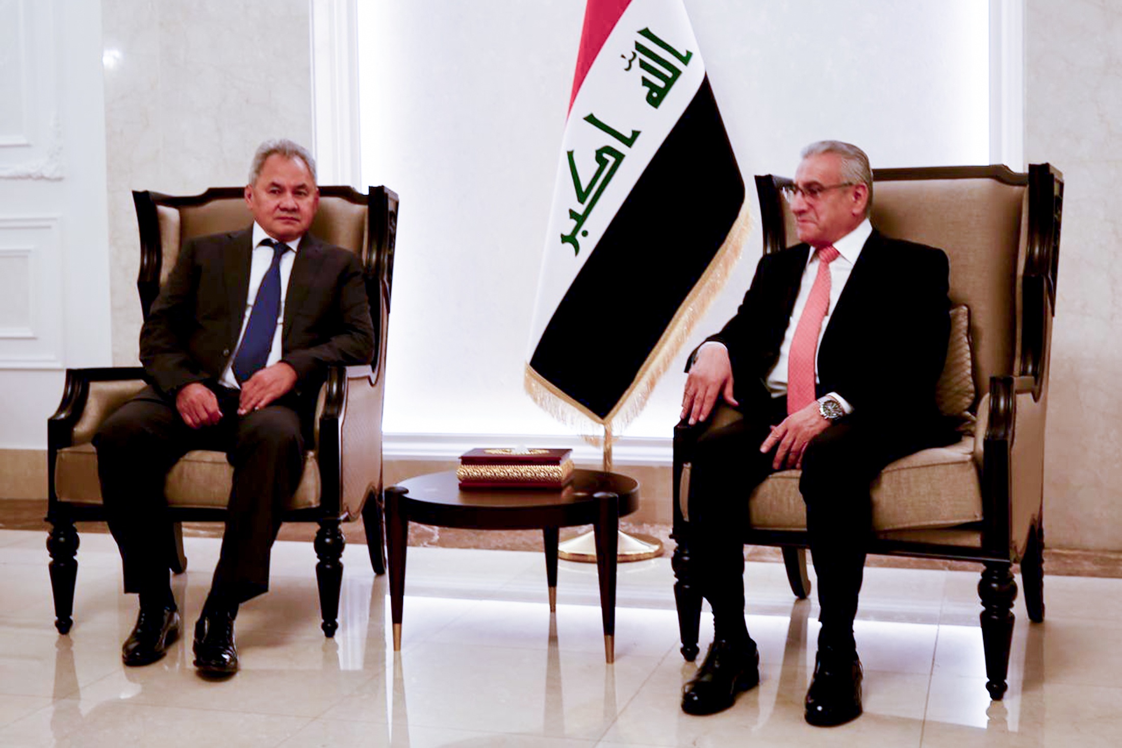 Первая встреча прошла прямо в здании аэропорта. Сергей Шойгу поговорил с заместителем советника премьер-министра Ирака по национальной безопасности Али Насером.