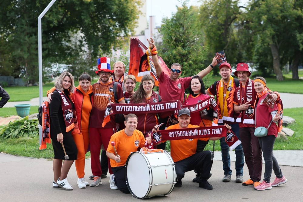 Скучать в ожидании стартового свистка не пришлось. "Темп" славится не только тактически грамотной игрой и твердым характером, но и умением работать с поклонниками. Бордово-оранжевые трибуны, заполненные зрителями всех возрастов - от малых детей до пенсионеров со стажем - не умолкали ни на минуту. Барабанный грохот, кричалки и песни про любимую команду, флаги и шарфы, живые волны и гневный гул после фолов соперника и по поводу некоторых судейских решений, аплодисменты красивым передачам, финтам и ударам футболистов "Темпа", всеобщий стон после нереализованных голевых моментов у ворот гостей. "Темп", "Темп", только "Темп"! - дружно скандировали поклонники. Главное достоинство болельщиков "Темпа" - отсутствие агрессии, нередко сопутствующее поклонникам других команд. Играть при доброжелательных трибунах - удовольствие для обеих команд.
