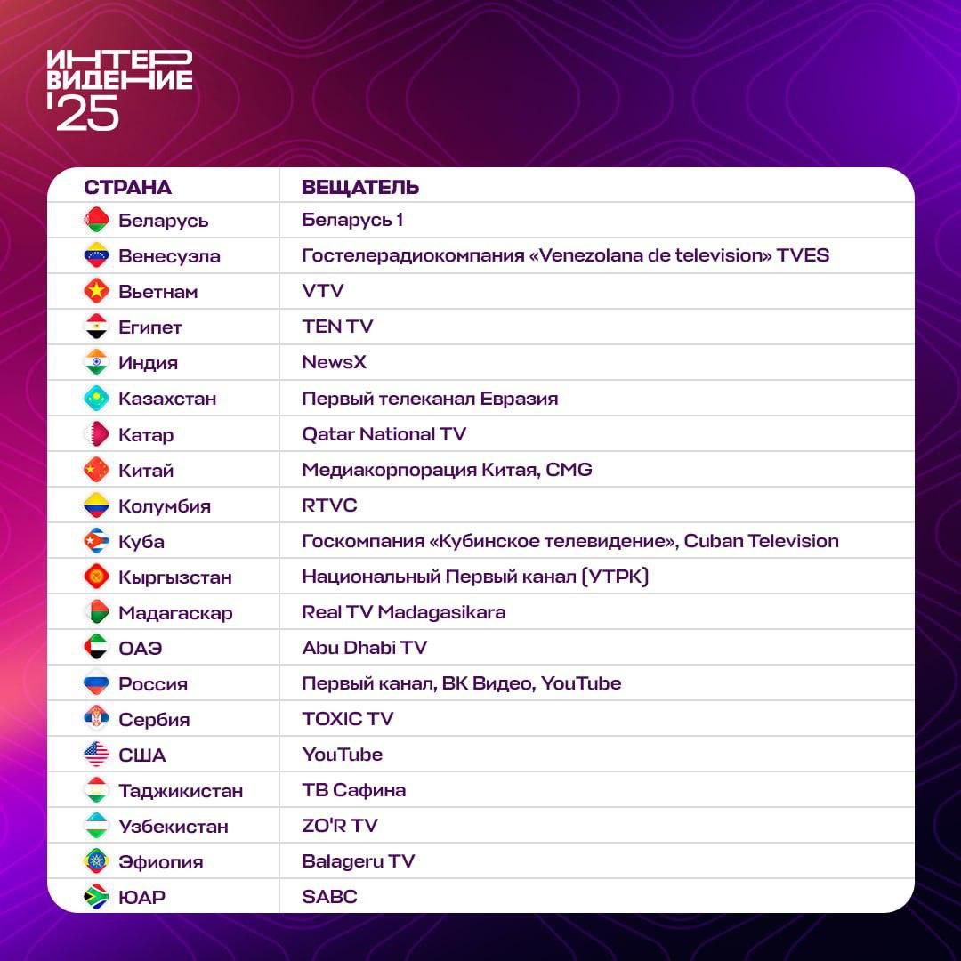 19 из 23 стран, участвующих в "Интервидении", проведут трансляцию конкурса на своих государственных, частных каналах или интернет-видеоплатформах.