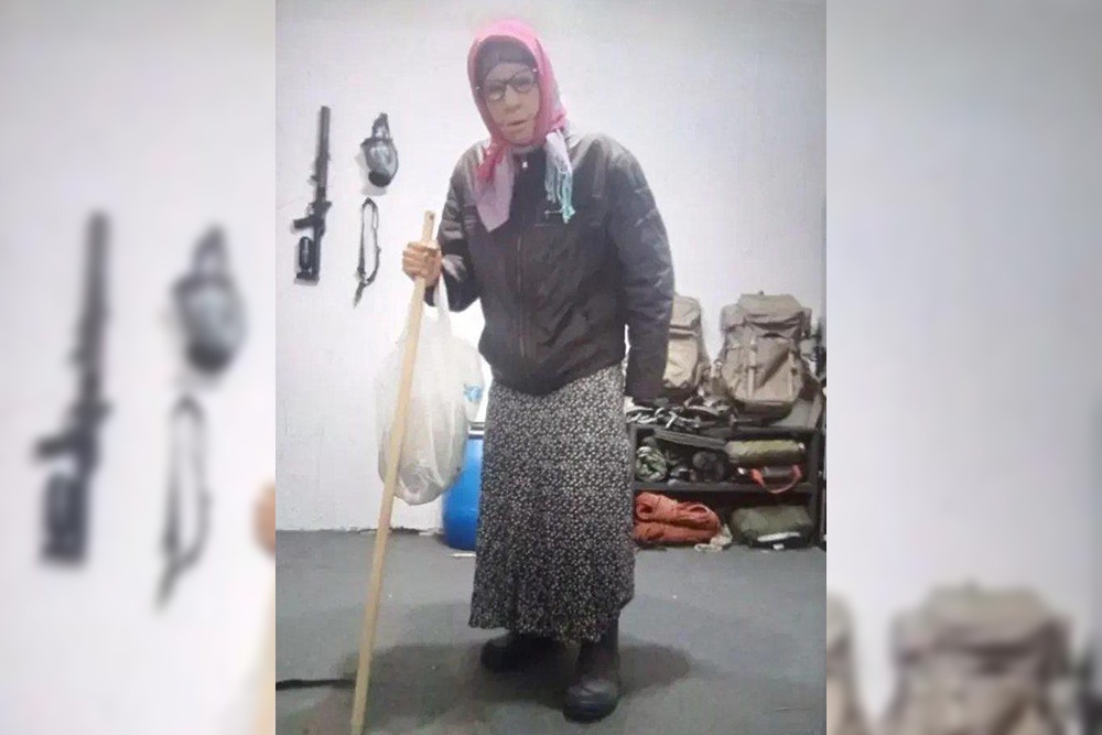 Фото, по-видимому, было сделано в рамках подготовки к совершению преступления. На снимке изображен молодой человек, одетый в серую юбку, черную куртку, ярко-розовый платок и очки. В руках у него пакет и большая палка.