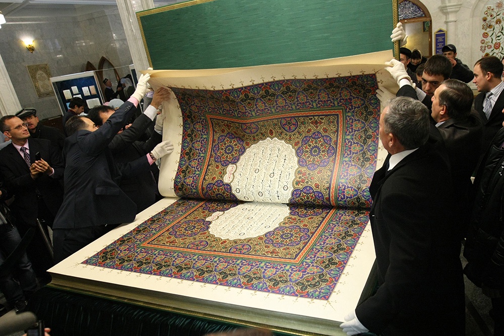 Особенно Султана Ибрагима впечатлил самый большой в мире печатный Коран. Ее размер - полтора на два метра, а вес около 800 килограммов. Обложка фолианта сделана из кожи и малахита. Она украшена бирюзой, кораллами, топазами, аметистами, яшмой. Срезы страницы покрыты сусальным золотом.