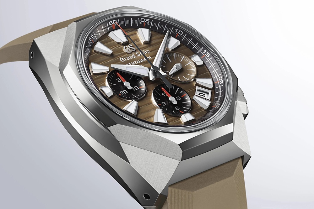 Первый механический хронограф Grand Seiko, названный Tentagraph (до этого хронографы бренда были электромеханическими). Золотисто-коричневый циферблат с узором "вдохновлен гривой льва, развевающейся на ветру" (лев - символ бренда). Новая серия спортивных часов отличается резкими углами и смелым дизайном крупного корпуса. Специальный сплав Brilliant Hard Titanium в два раза прочнее стали. Водонепроницаемость - 200 метров.