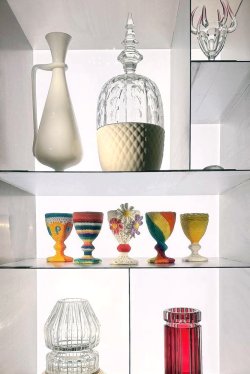 Сочетание кожи и хрусталя подчеркивает строгие геометрические линии графинов, придавая им современности.