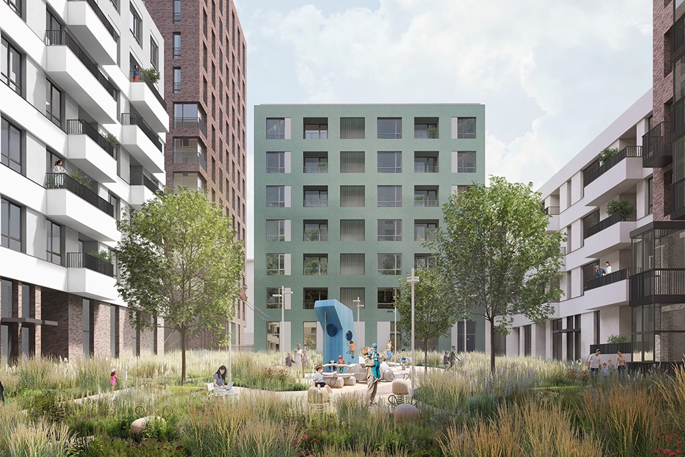 В результате получилась гармоничная интеграция застройки в сложившийся район и ее органичное включение в водно-зеленую структуру территории.