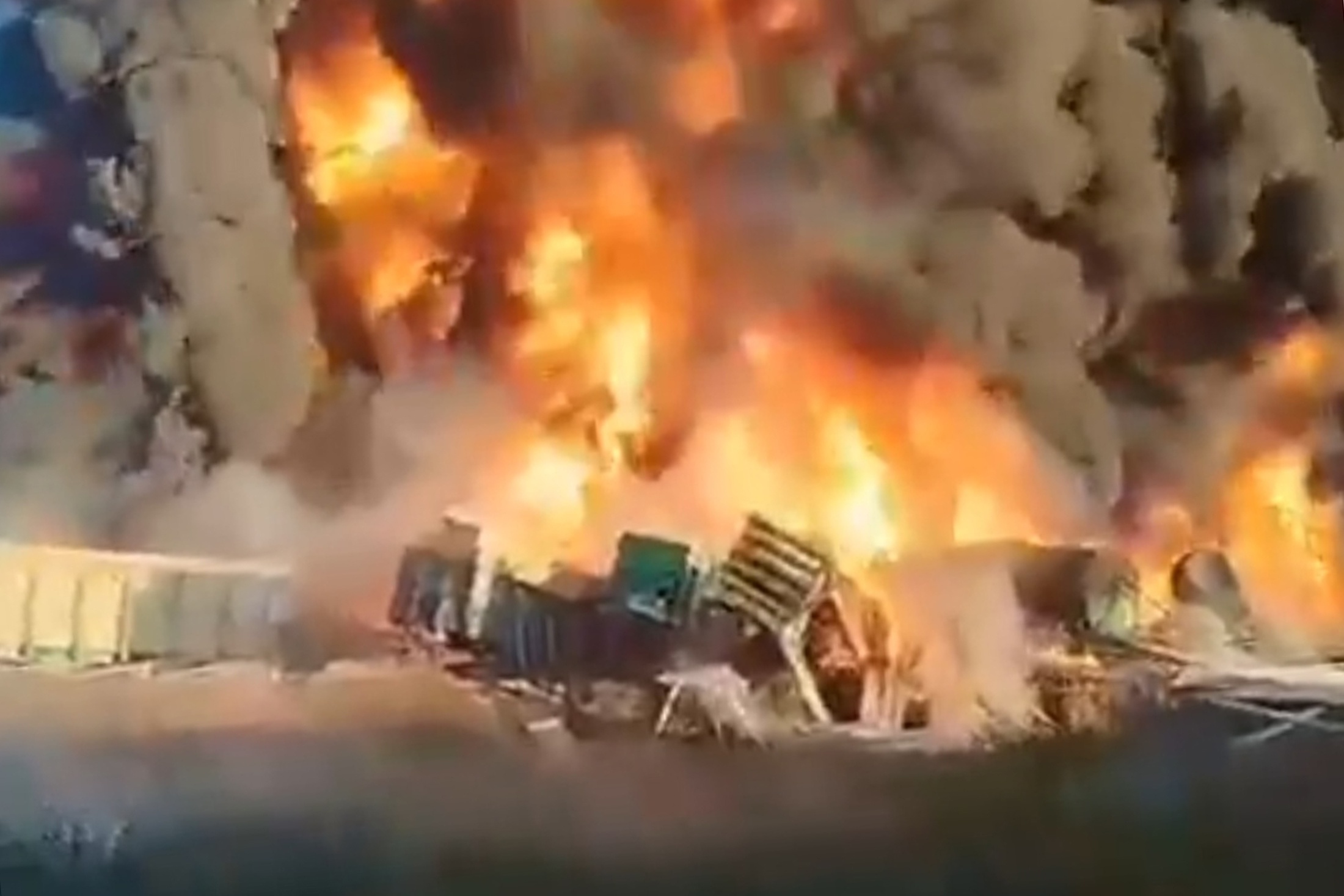 18 вагонов вместе с локомотивом сошли с рельсов, вспыхнул мощный пожар, который сейчас тушат.