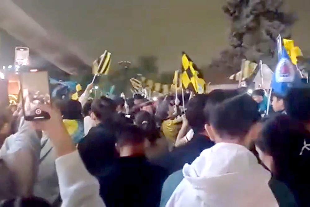 А тем временем в парочке минут ходьбы от стадиона болельщики "Кайрата" распевают песни в честь любимой команды. Судя по всему, они никуда не спешат. Вполне возможно, что у них нет билетов на игру: много людей, даже несмотря на отсутствие возможности попасть на матч, тем не менее приехали к месту проведения матча.