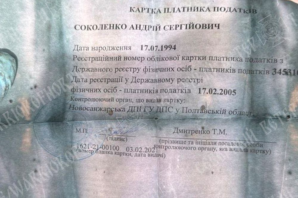 Это Андрей Соколенко из Полтавской области, 1994 года рождения. Найденная в его вещах бумага подтверждает, что он являлся зарегистрированным на Украине налогоплательщиком.