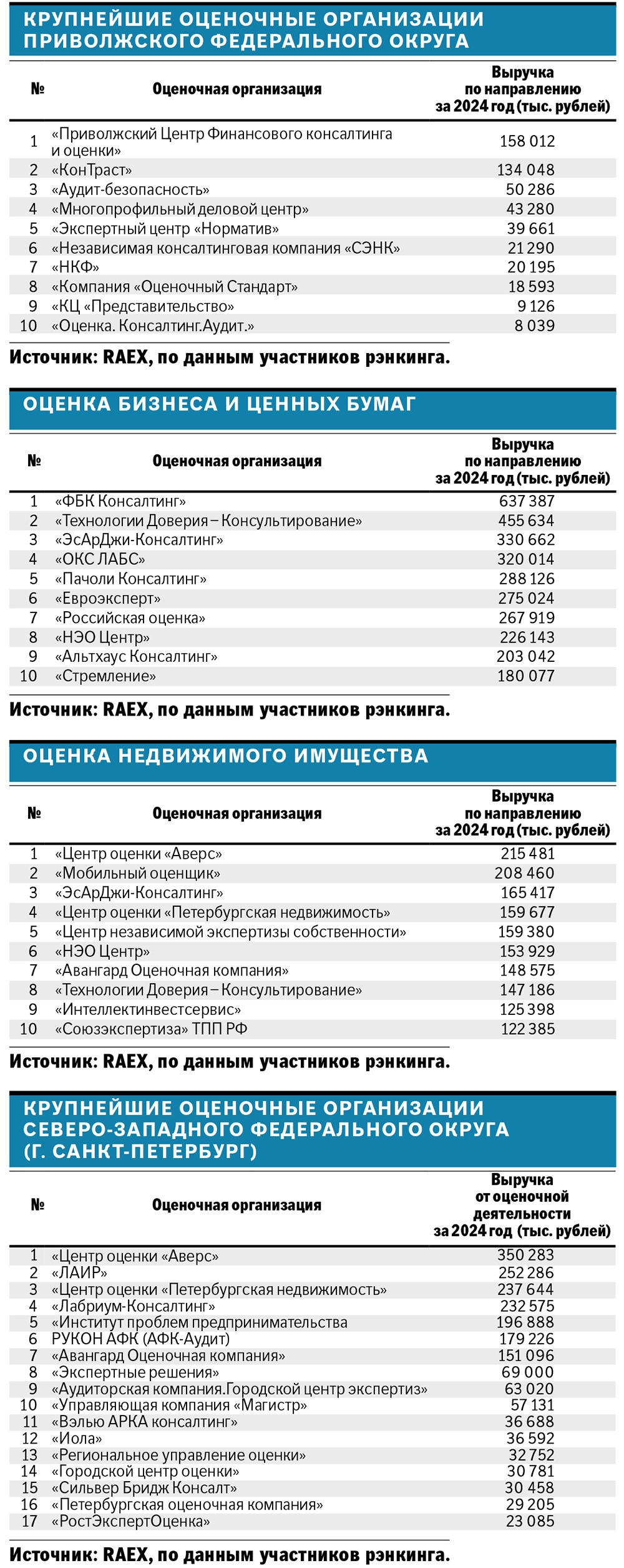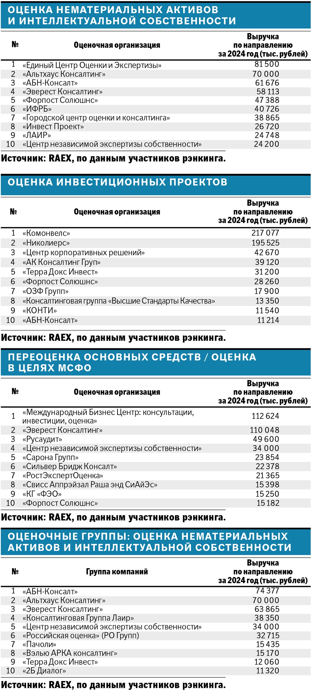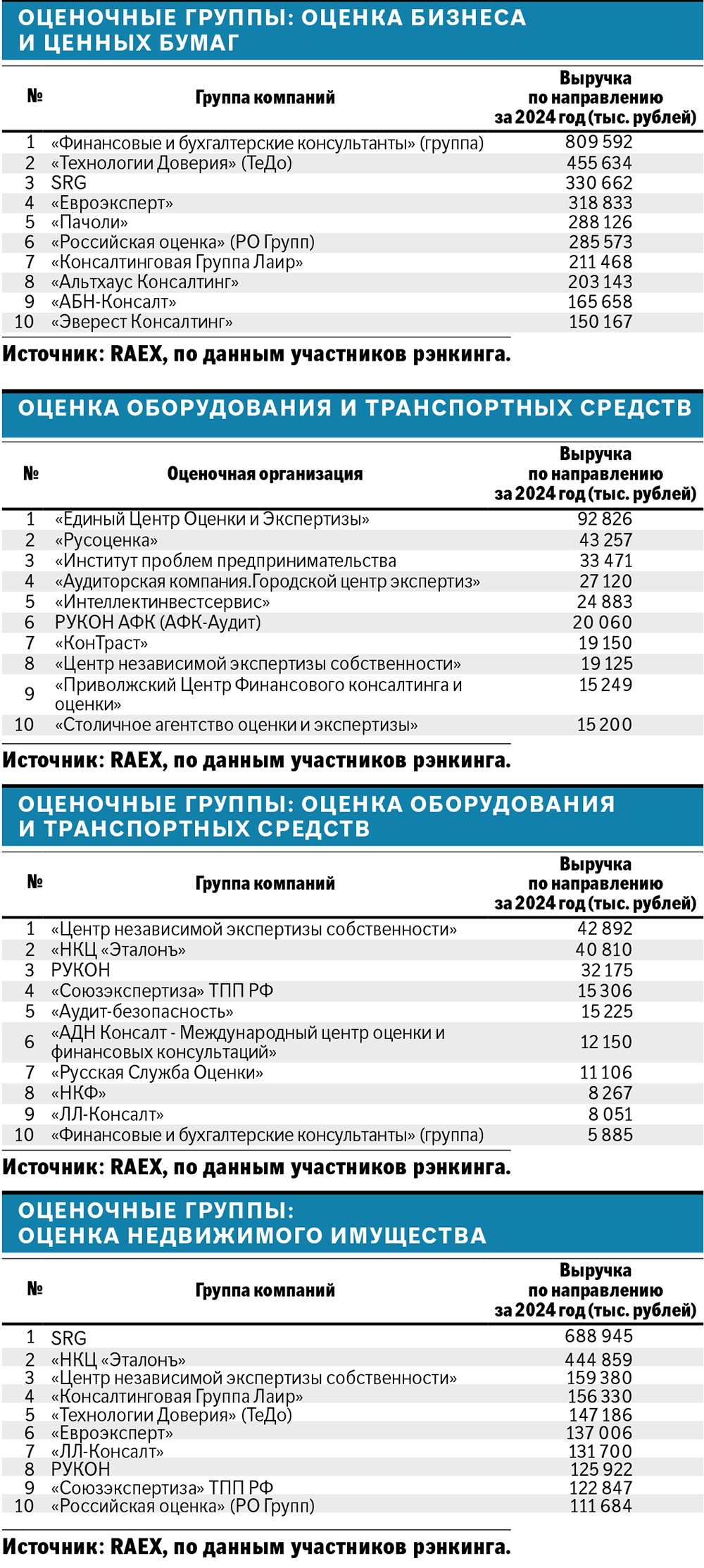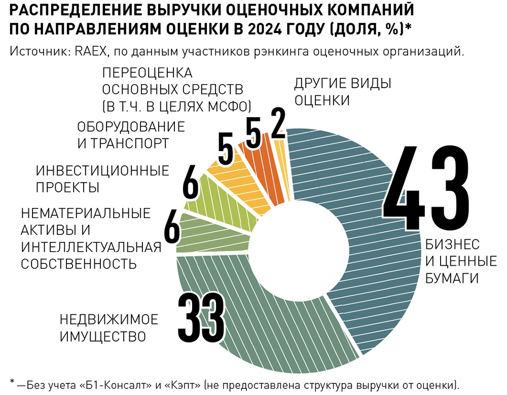 Наибольший объем выручки участников рэнкинга традиционно приходится на оценку бизнеса и ценных бумаг: за 2024 год она достигла 5,7 миллиарда рублей (44 процента от всего дохода по рэнкингу), увеличившись, по сопоставимым данным, на заметные 22 процента. Двигатели спроса - процессы смены собственников, реструктуризации и консолидации, сделки с активами, привлечение инвестиций, в том числе подготовка компаний к размещению на IPO, а также потребности в оценке акций, заблокированных из-за санкций.