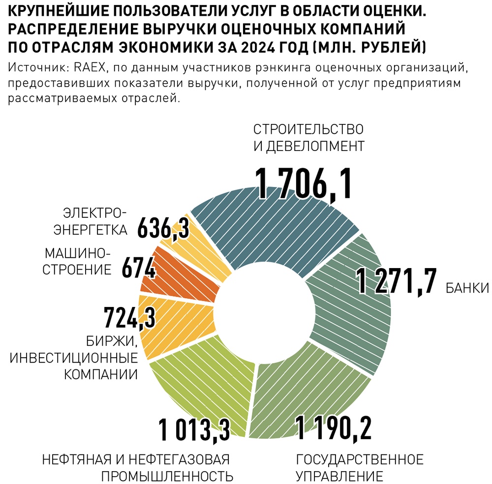 Основными пользователями услуг оценки в 2024 году по объему полученной выручки стали четыре отрасли: строительство и девелопмент, банки, государственное управление, нефтяная и нефтегазовая промышленность. Суммарная выручка участников рэнкинга в этих сферах составила 1706, 1272, 1190 и 1013 миллионов рублей соответственно (расчеты произведены исходя из общего объема выручки 11 797 миллионов рублей, предоставленной участниками рэнкинга, которую они структурировали по отраслям).