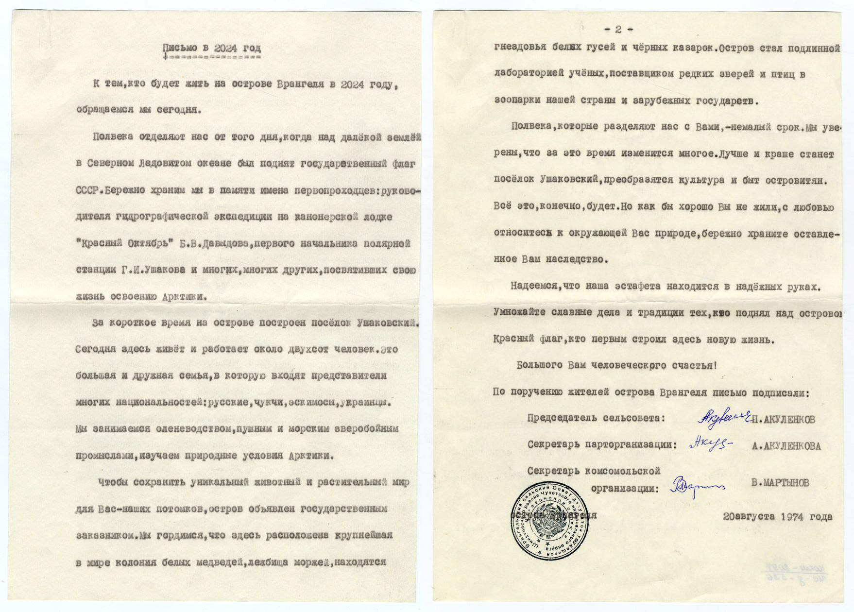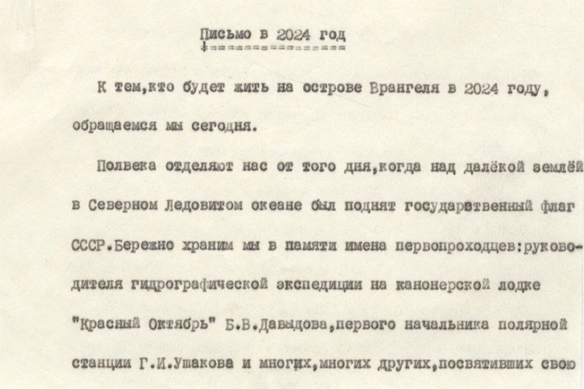 "Более 100 лет назад, в 1924 году, команда экспедиции на канонерской лодке "Красный Октябрь" подняла советский флаг на острове Врангеля, утвердив наш суверенитет над этими землями. Через два года правительство официально закрепило эти территории за СССР. В 1926 году здесь появилось первое постоянное поселение. В 1974 году, в день 50-летнего юбилея этого события, участники полярной экспедиции заложили на острове капсулу времени - послание нам, ныне живущим. Теперь наша очередь поделиться с потомками своим видением будущего Арктики, которая сегодня находится в зоне интересов многих государств", - приводит пресс-служба РГО слова вице-президента Русского географического общества РГО Артема Манукяна.
