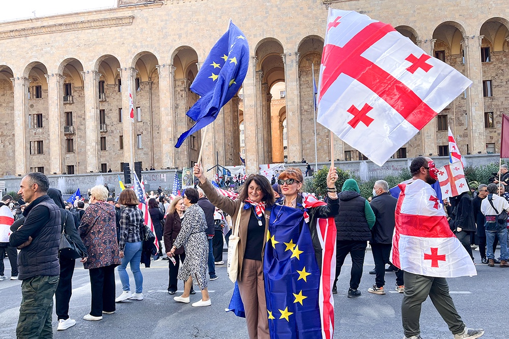 Манифестация приурочена к выборам в органы местного самоуправления, однако главным требованием оппозиции является возобновление курса на евроинтеграцию. Этот процесс был приостановлен в связи с вмешательством Запада во внутренние дела Грузии. Как сообщается, в собравшейся толпе видны флаги ЕС и США.
