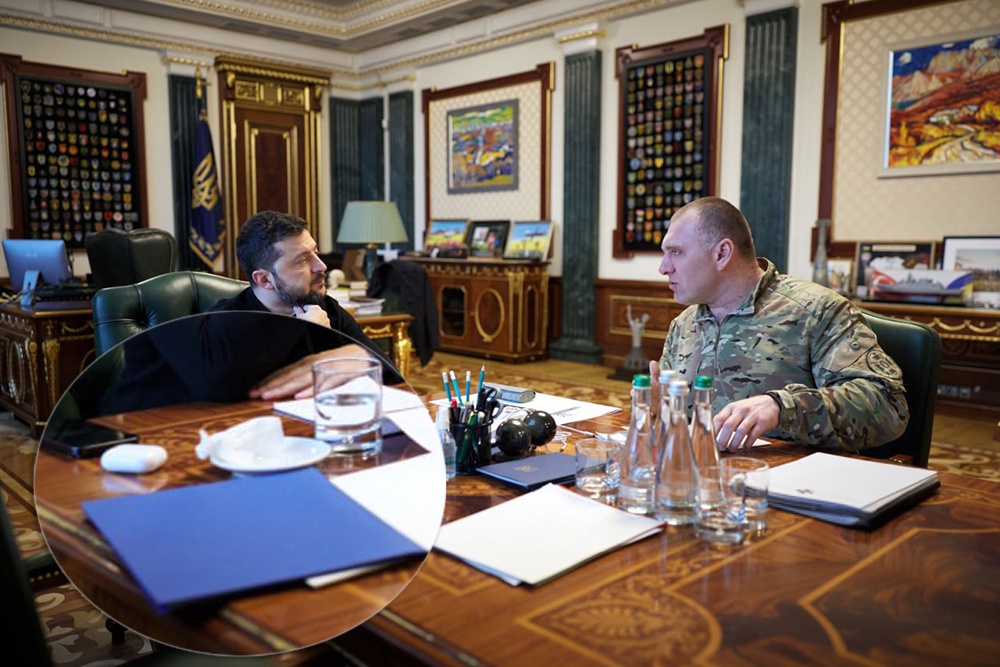 На фотографии изображен сидящий за столом Зеленский. Перед ним лежит блокнот, а также стоят кофейная чашка, стакан с водой и блюдце с неким белым свертком.