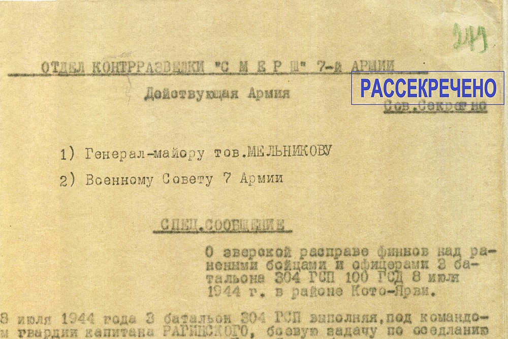 Центр общественных связей ФСБ опубликовал 9 сентября два спецсообщения от 16 июля 1944 года начальника отдела контрразведки "Смерш" 7-й армии полковника Алексея Исакова начальнику Управления контрразведки "Смерш" Карельского фронта генерал-майору Дмитрию Мельникову и Военному совету 7-й армии.