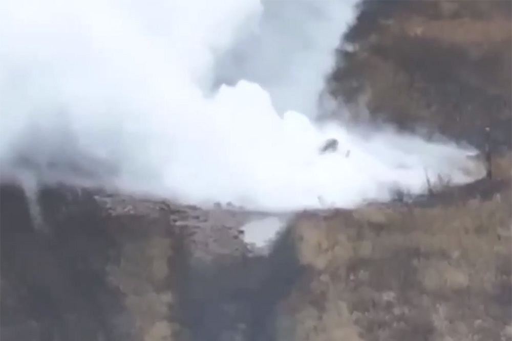На записи, сделанной с помощью дрона, виден процесс выброса остатков содержимого трубопровода в окружающую среду. По земле стелются густые облака белого цвета.