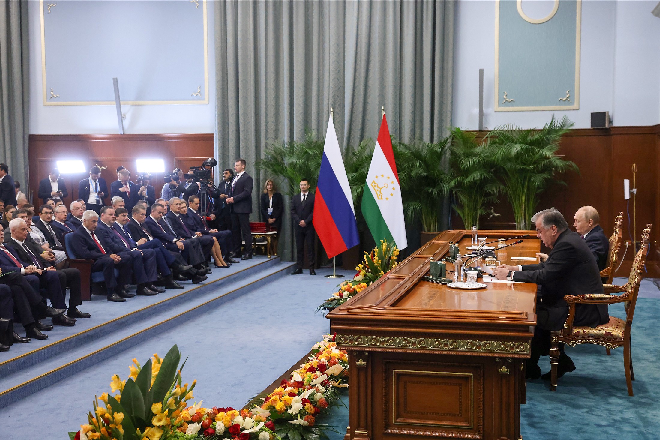 "Россия твердо настроена на дальнейшее укрепление стратегического партнерства и союзничества с вашими государствами, углубление взаимовыгодных политических, экономических, гуманитарных связей", - заявил Путин. "На всех этих направлениях уже удалось добиться действительно хороших результатов", - оценил он.
