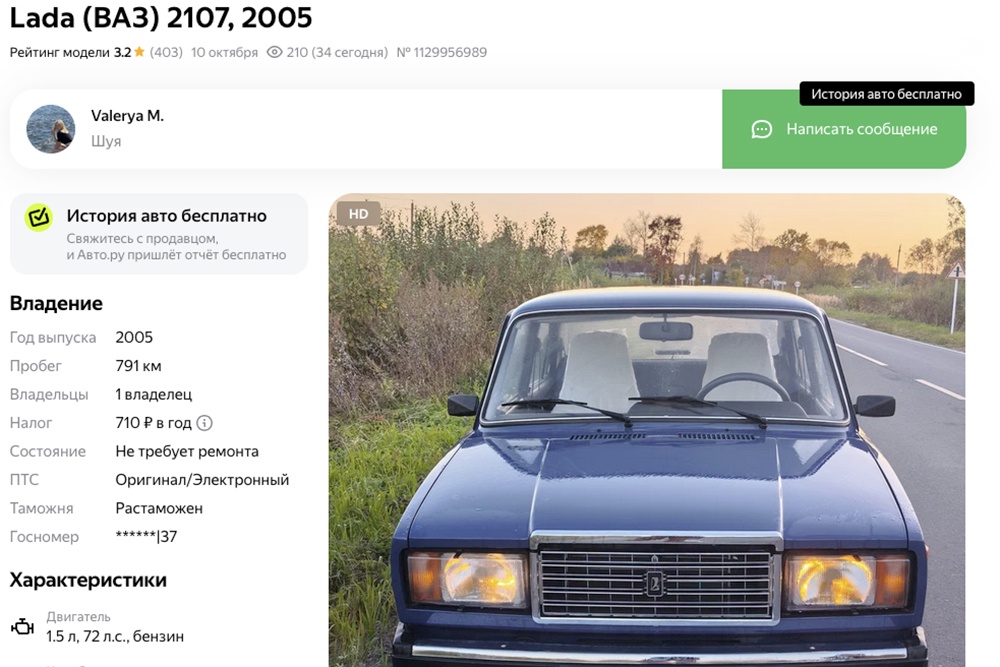 В России на продажу выставили 20-летний ВАЗ-2107 с пробегом 791 км