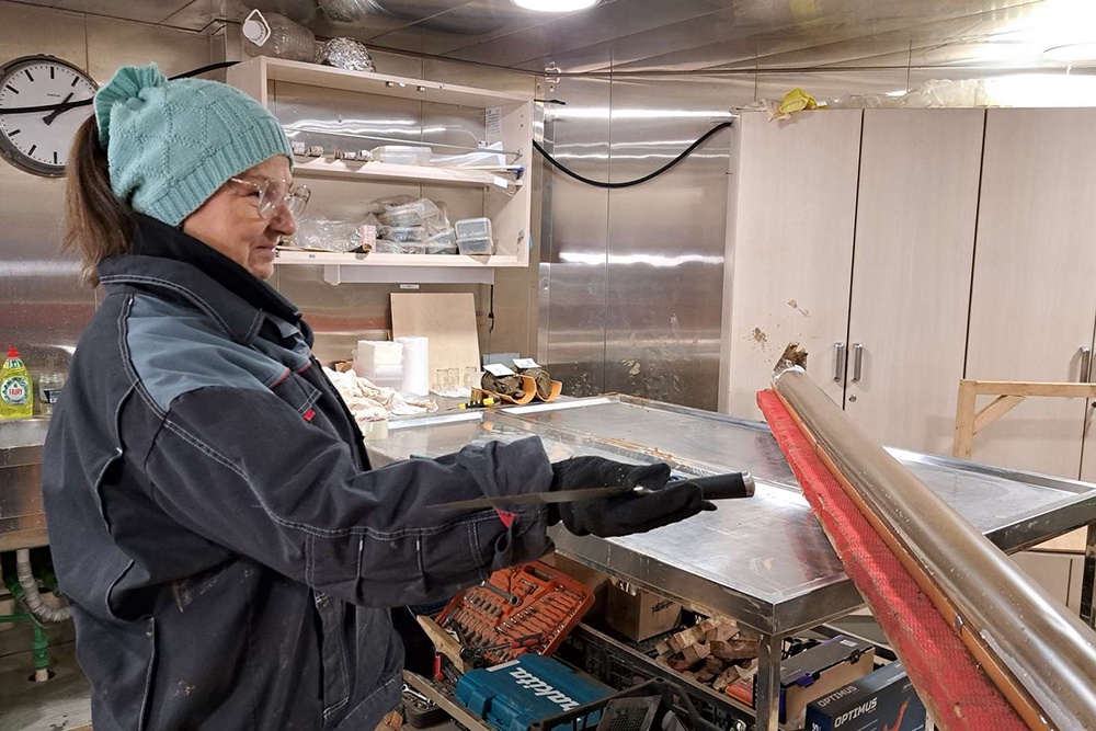 Океанологи опускают батометры и зонды - для отбора воды на разной глубине, а мы ковш, гравитационную трубу или бокскорер. Майна накрыта крышкой с греющим кабелем, чтобы вода не замерзала. Перед началом работы нужно спуститься на лед и открыть эту крышку. Старая лестница пришла в негодность. Купили новую.