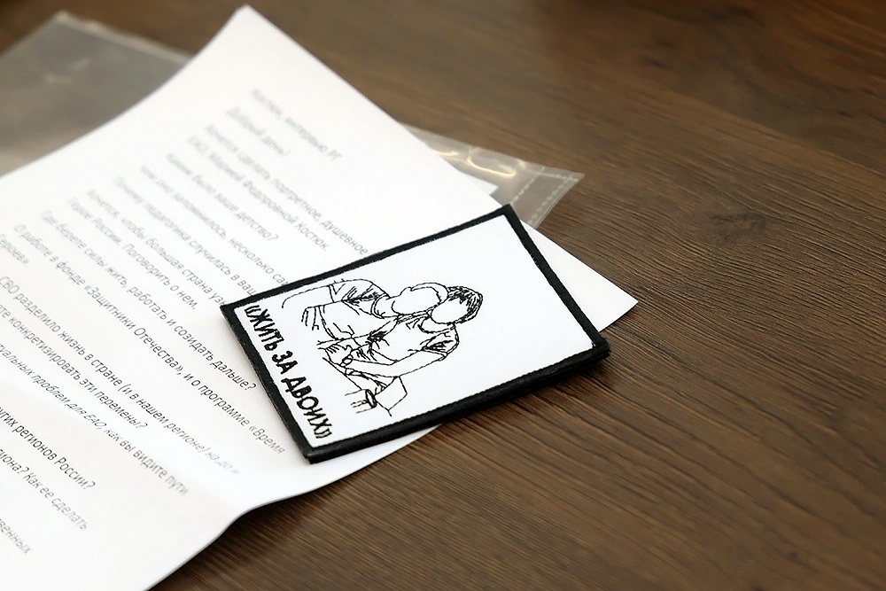 С этой фотографии Поля сделала шеврон, он для меня как образок. Теперь эти образки-шевроны разлетаются по всем регионам. Поля этим занимается. Получилась история преломления войны через военный символ-шеврон в мирную жизнь.