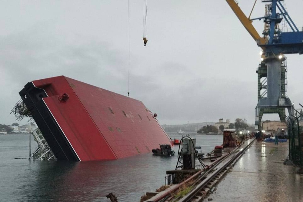 На ролике, опубликованном "ГТРК Севастополь", видно, как стрела крана с прикрепленным грузом медленно наклоняется вперед. Груз падает в воду и утягивает за собой подъемное устройство и весь плавкран. Корпус плавкрана переворачивается, огромная стрела и надстройка уходят под воду.