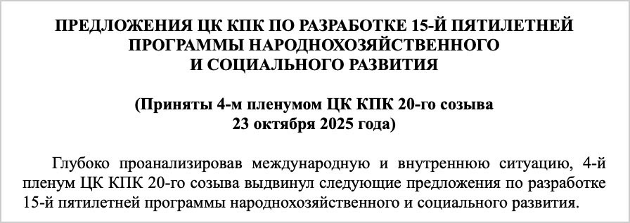 Предложения Центрального комитета Коммунистической партии Китая (ЦК КПК) по разработке 15-й пятилетней программы народнохозяйственного и социального развития страны были опубликованы в КНР.