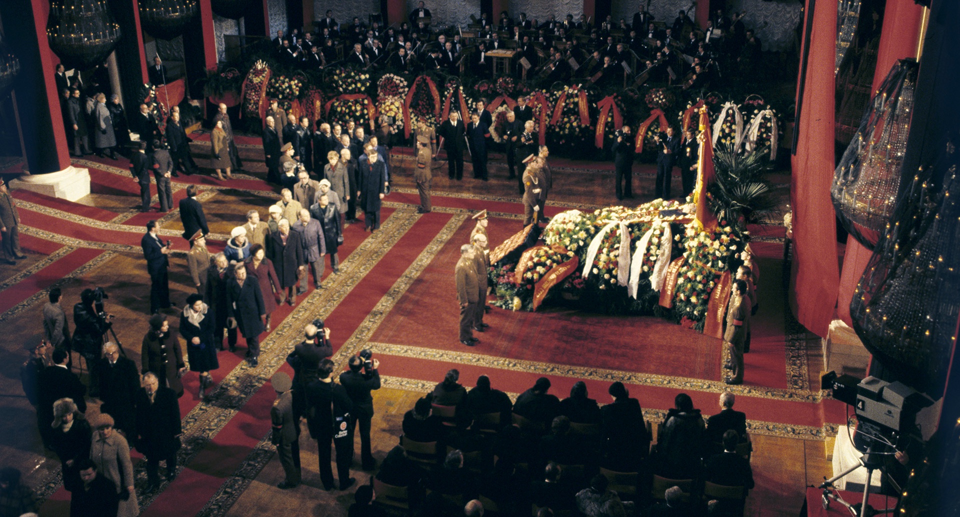 На примере похорон Брежнева можно увидеть уже сложившийся советский ритуал: сначала Колонный зал Дома Союзов, объявление дней государственного траура с траурным убранством городов, трансляция траурной музыки по радио и телевидению, гроб с телом на артиллерийском лафете в сопровождении почетного эскорта двигается на Красную площадь. Если добавить к этой картине траурные речи руководителей государства, стоящих на трибуне Мавзолея, картина будет почти законченной. У Брежнева был еще оглушительный гудок: все предприятия и организации СССР прощались с генсеком. Остановился транспорт, когда гроб опускали в могилу, грянул пушечный залп. Остальных хоронили скромнее.