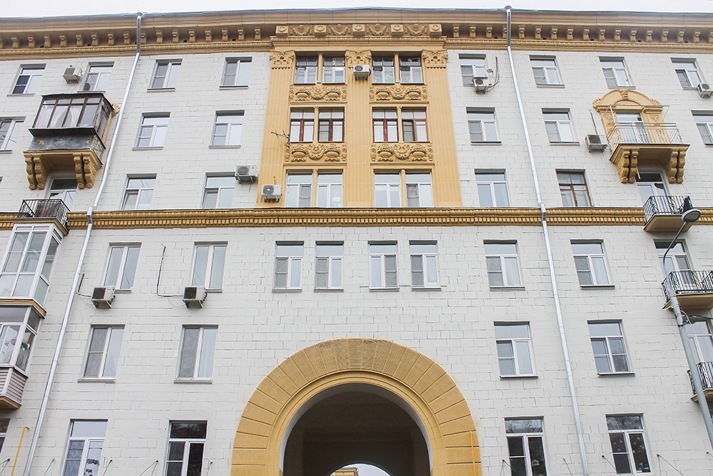 Продолжится экскурсия возле дома № 35/1 по улице Зои и Александра Космодемьянских. Он был возведен в 1956 году по индивидуальному проекту в стиле советского неоклассицизма. Нижний этаж акцентирован рустом, верхние - украшены пилястрами с капителями и барельефами.