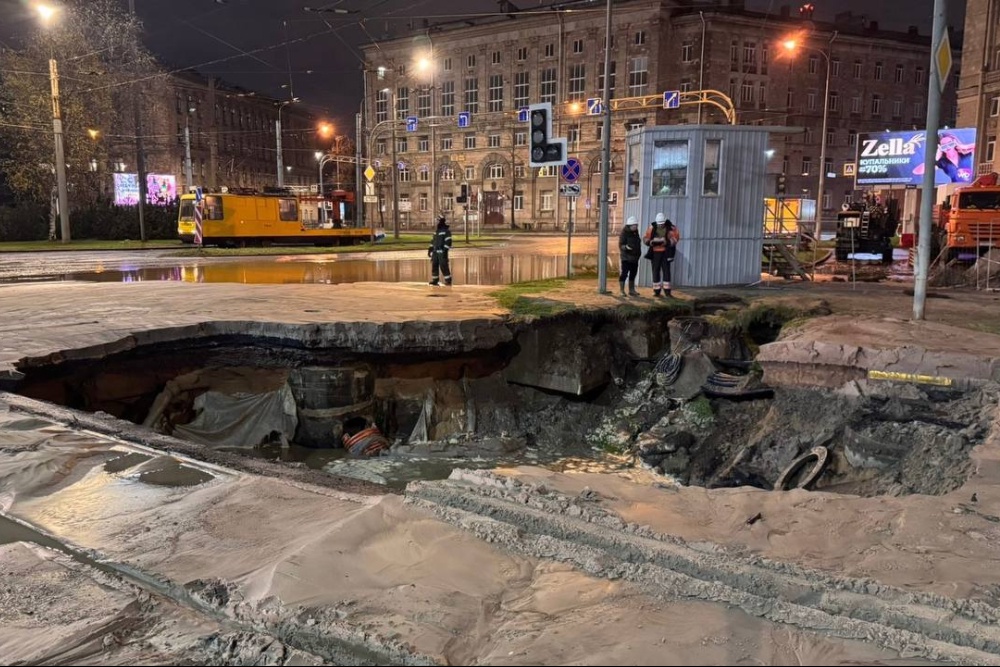 Авария произошла вчера. Просадка грунта на значительной площади привела фактически к блокировке участка оживленной транспортной магистрали. Общественный транспорт были вынуждены пустить по измененным маршрутам.