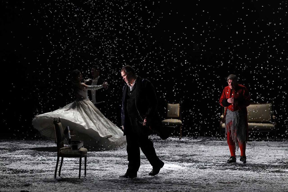 А еще одним из главных действующих лиц становится снег. Он тут не менее важен, чем в постановках любившего использовать его Римаса Туминаса. Снег и национальная забава, и беда, он то умиротворяет, а то сбивает с пути. Его сгребают лопатой и пинают с досады. Дети нарезают из бумаги снежинки и играют в снежки. Во многом благодаря снегу постановка волшебно красива (художник Ольга Шаишмелашвили). И очень впечатляет сцена первой встречи Анны с Вронским (Нил Кропалов), когда под волнующую музыку снежинки сначала слабо вьются в луче света, а потом вдруг обрушиваются лавиной. Понятно, что страсть на героев сваливается внезапно, как снег на голову.