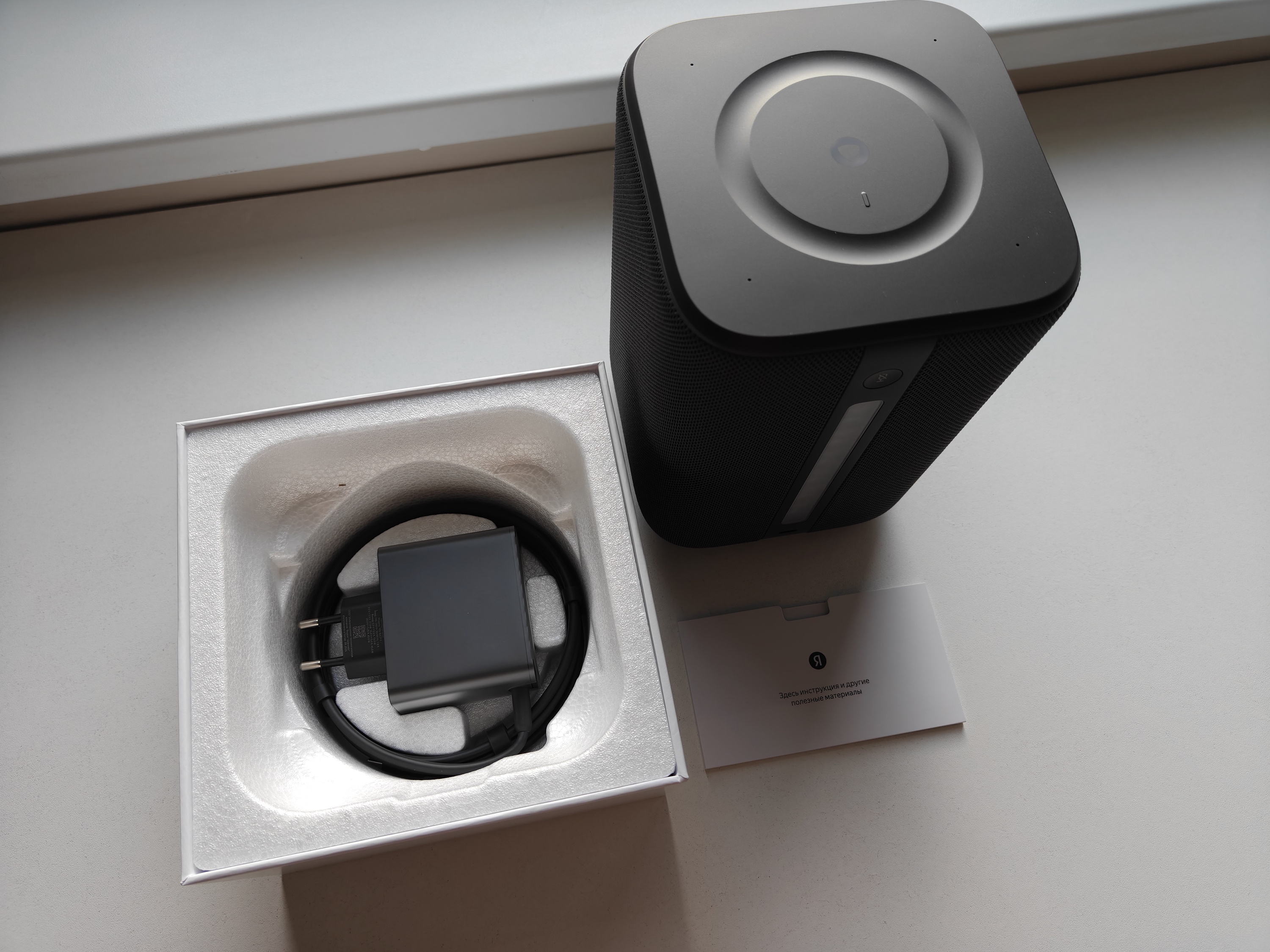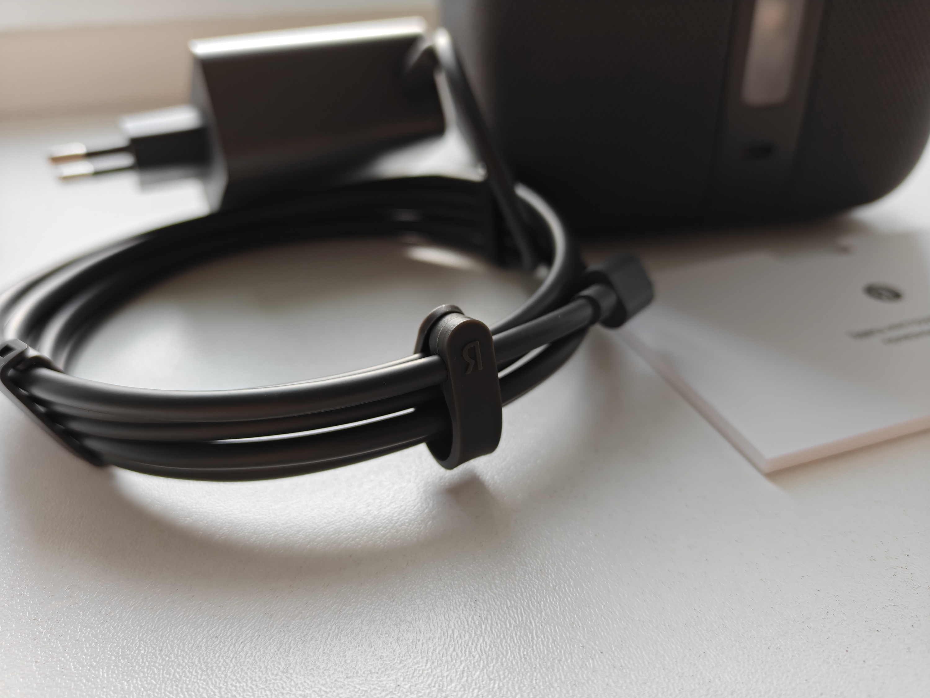 В коробке пользователя, помимо самого девайса, ждут: минималистичный набор бумажных карточек с основной информацией по техническим характеристикам и первичной настройке и некомпозитные провод и блок питания.