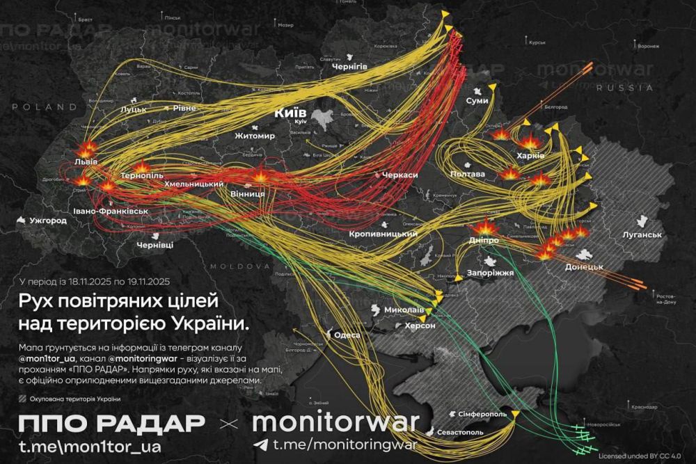 Накануне ВСУ попытались ударить американскими баллистическими ракетами ATACMS по гражданским объектам в Воронеже. Все ракеты сбила ПВО, никто не пострадал. Ответным ударом были уничтожены украинские пусковые установки в Харьковской области. Затем начался массированный налет ракет и дронов на Украину.
