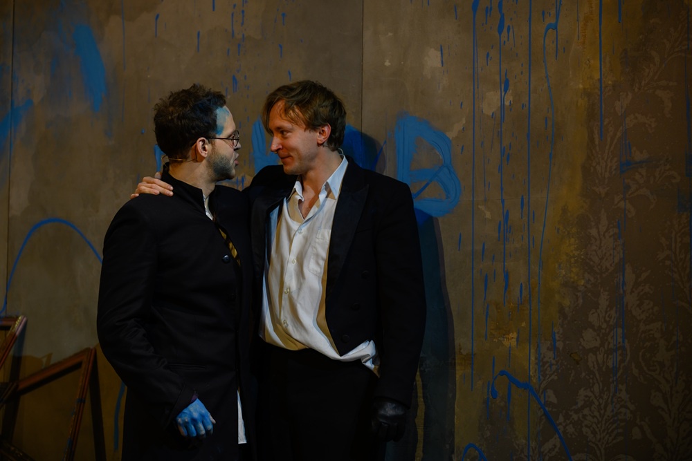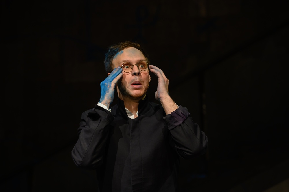 Внутреннее преображение во многом дано через внешнее: сначала Парфен - в своих гимназистских очках и мундирчике, потом - все в тех же очках и майке-алкоголичке… В сцене убийства, которая закольцовывает спектакль, он надевает фальшивую бороду и выдает последнее, отчаянное представление, которого от него ждут.