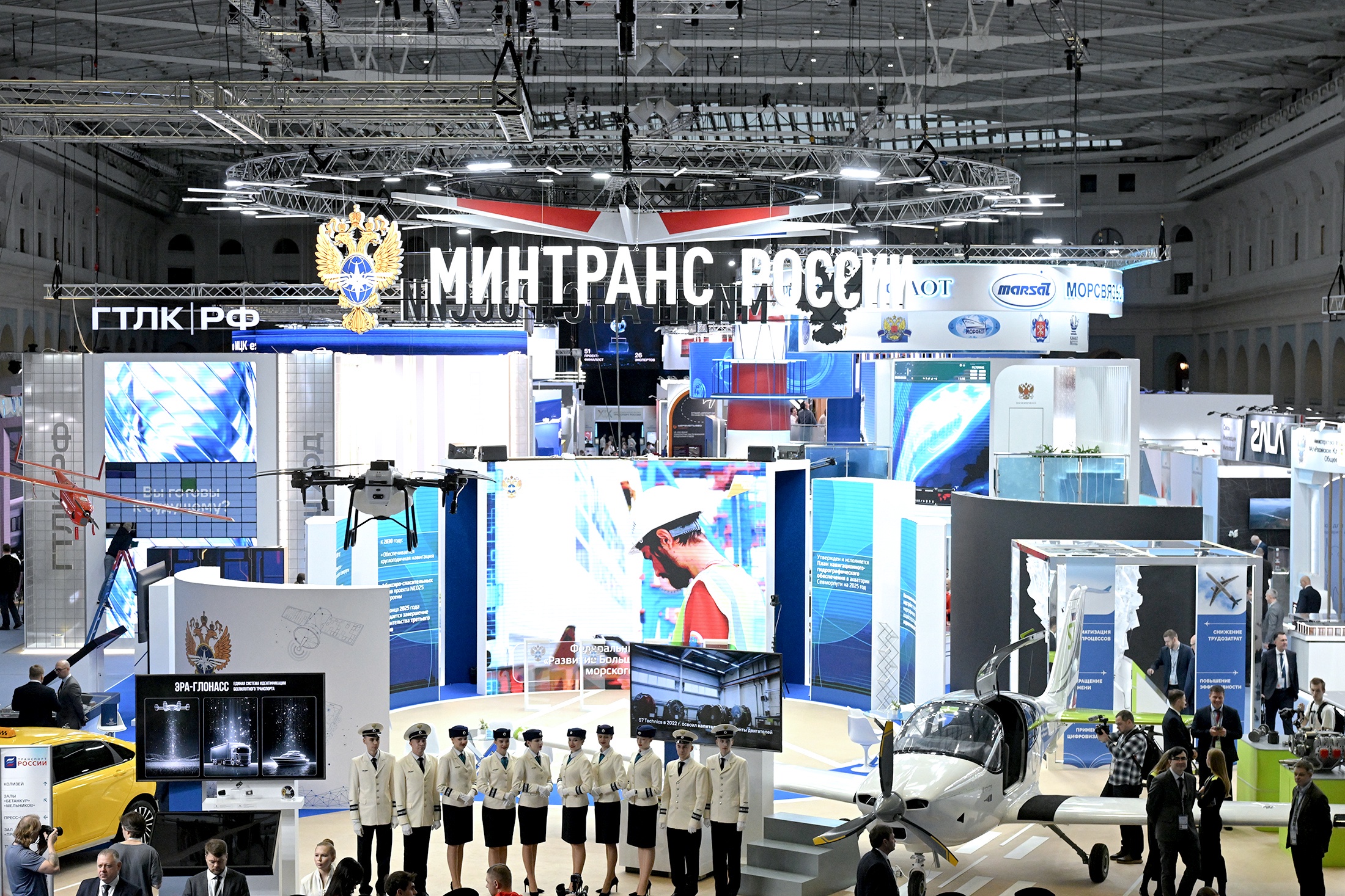 На площадке Гостиного Двора развернулась яркая экспозиция, объединившая ключевые достижения и новейшие решения транспортной отрасли страны. Центральным элементом стал объединенный стенд национальных проектов, на котором представлены развитие инфраструктуры, цифровые сервисы управления, внедрение беспилотных технологий и промышленные решения для обеспечения мобильности.