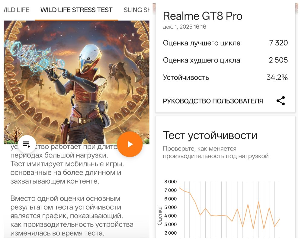 Так, в 30-минутном CPU Throttling Test мы получили нагрев (в чехле - ок, а вот без него держать смартфон немного некомфортно) и, как следствие, снижение производительности до 65% для стабилизации температуры. В принципе, с учетом общей мощности это нормально. Запас у Snapdragon 8 Elite Gen 5 огромный, но вот в 3DMark Wild Life Stress Test стабильность оказалась на уровне 34,2%. Это все же маловато.