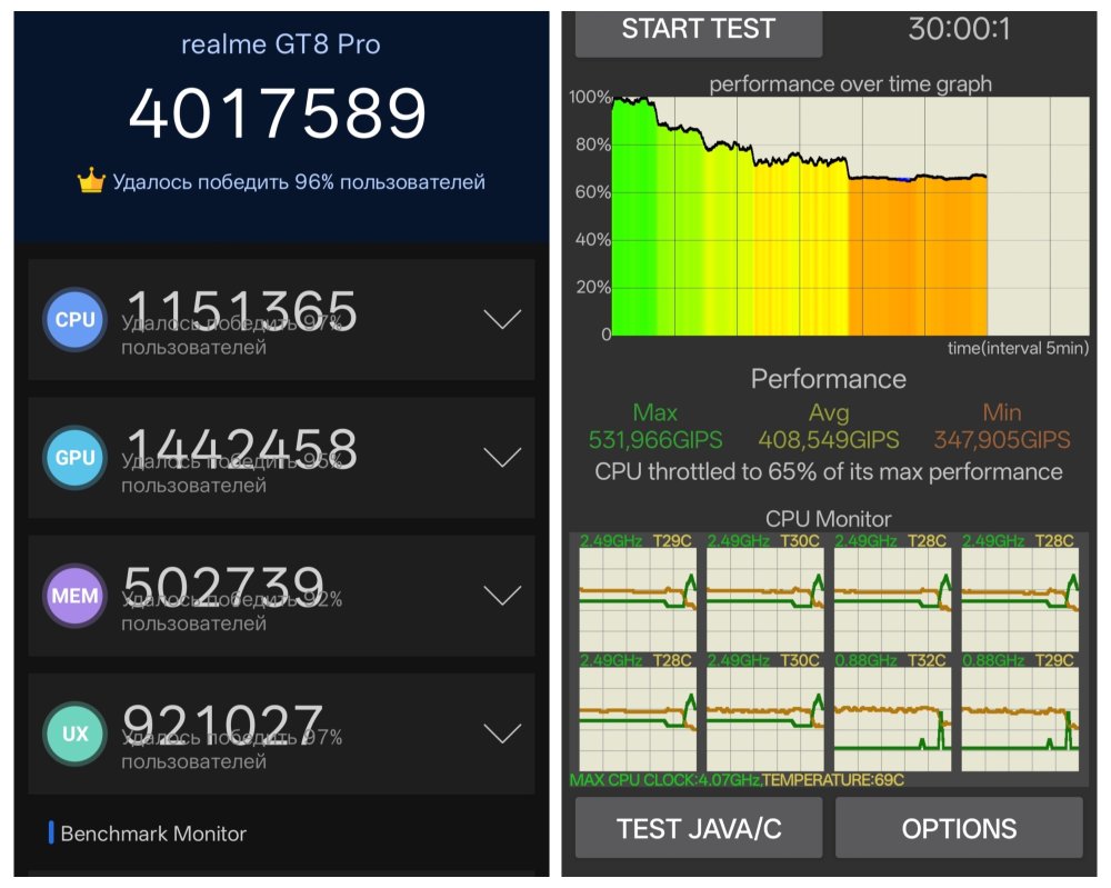 Да, в режиме GT Boost 3.0 в PUBG Mobile, Call of Duty Mobile и даже в Genshin Impact фреймрейт на максимальных настройках графики был выше 60 (в некоторых играх даже выше 100), но ненадолго - потом снижался до 60 fps. Это тоже очень неплохо, но все же хотелось большей стабильности, и кажется, что разработчики realme GT 8 Pro немного перестраховались с контролем температуры процессора и аккумулятора (за это тоже отвечает отдельный чип). В общем, ждем обновления ПО с оптимизацией игрового процесса.